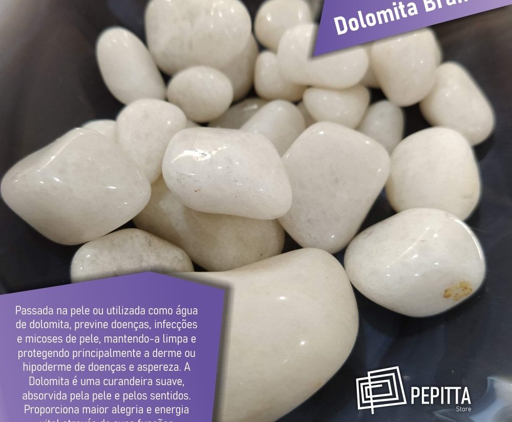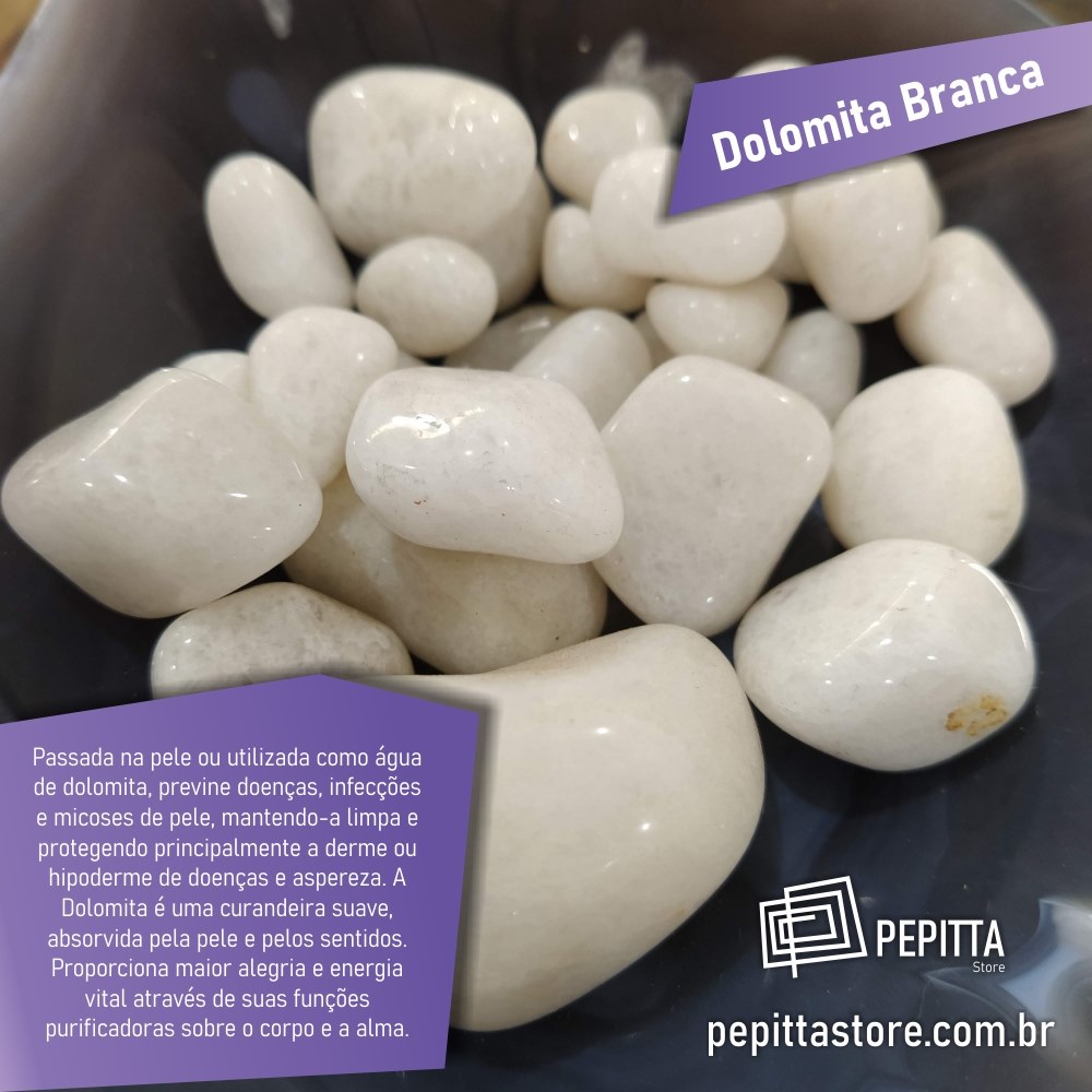 Dolomita branca – Passada na pele ou utilizada como água de dolomita, previne doenças, infecções e micoses de pele, mantendo-a limpa e protegendo principalmente a derme ou hipoderme de doenças e aspereza. A Dolomita é uma curandeira suave, absorvida pela pele e pelos sentidos. .