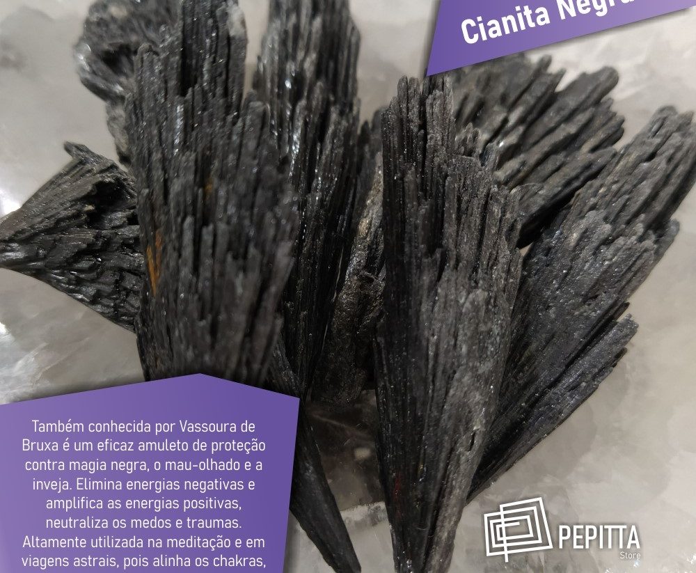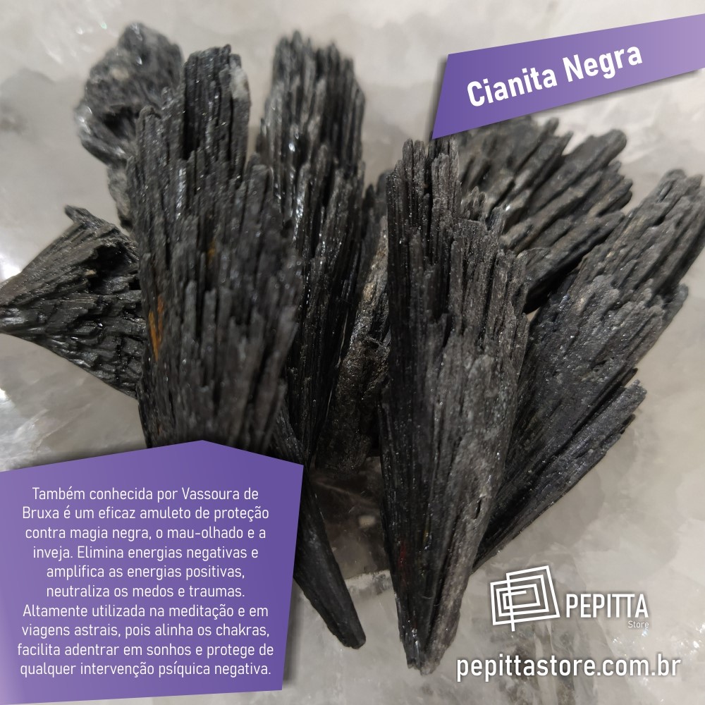Cianita Negra – também conhecida por Vassoura de Bruxa é um eficaz amuleto de proteção contra magia negra, o mau-olhado e a inveja. Elimina energias negativas e amplifica as energias positivas, neutraliza os medos e traumas. Altamente utilizada na meditação e em viagens astrais, .